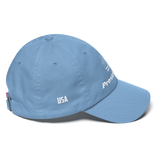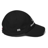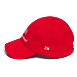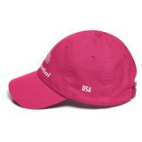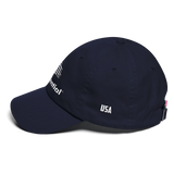 This hat is made in the USA, so wear it proud! It's unstructured with a curved visor and adjustable strap, and an American flag sewn on the back.